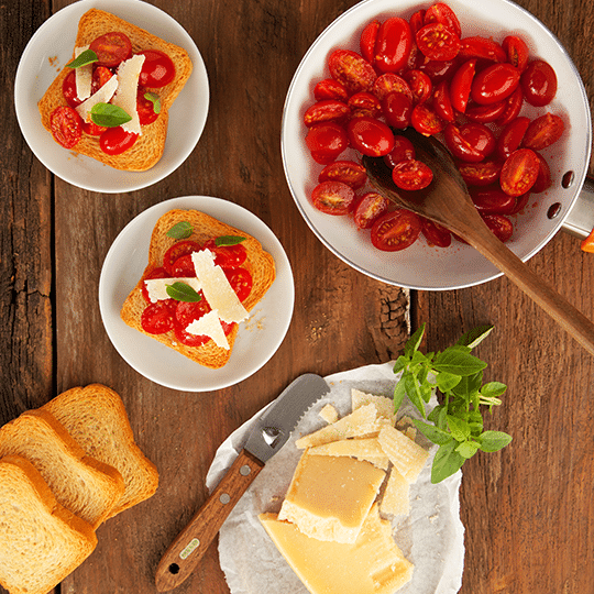 • Porcione sobre as torradas e polvilhe-as com o parmesão.