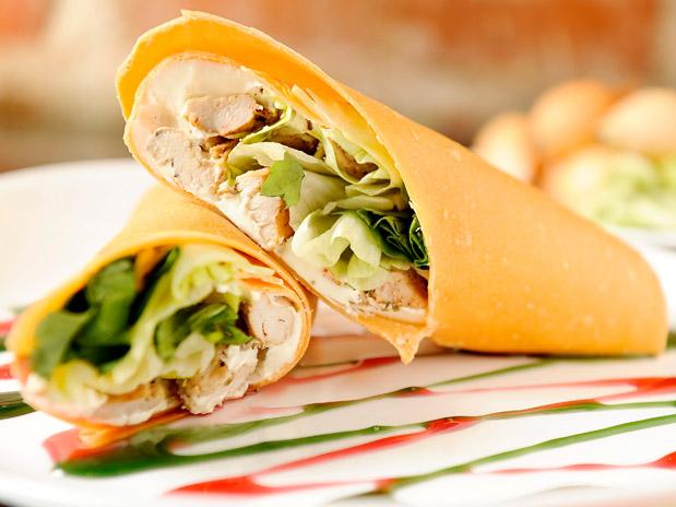• Para terminar, abra a tortilha, coloque o recheio e o mix de folhas verdes e enrole para sirva.